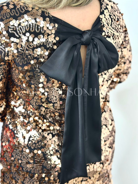 Vestido de lantejoulas dourado com laço de cetim
