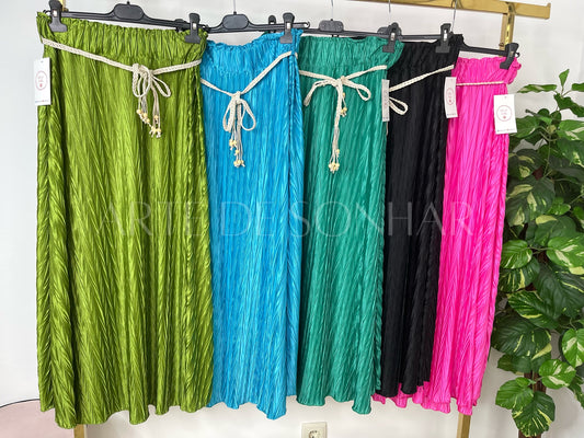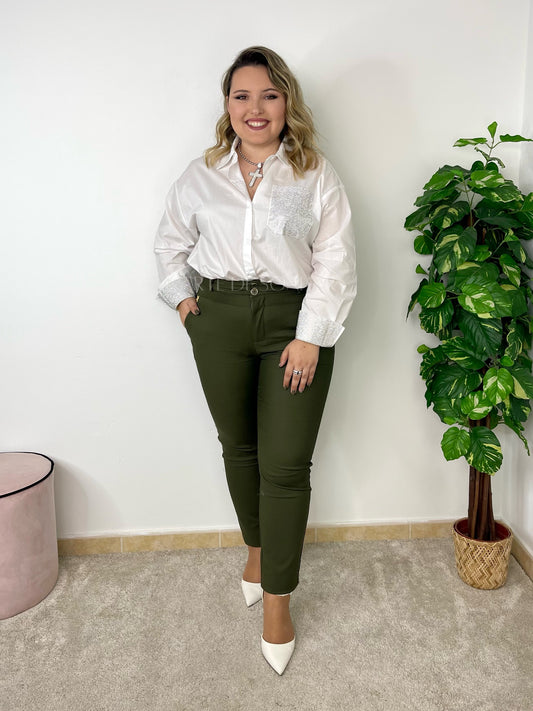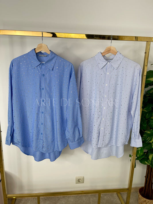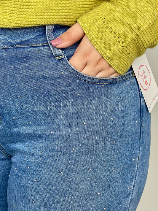 Calças de ganga clara wide leg com cristais e farripos no fundo