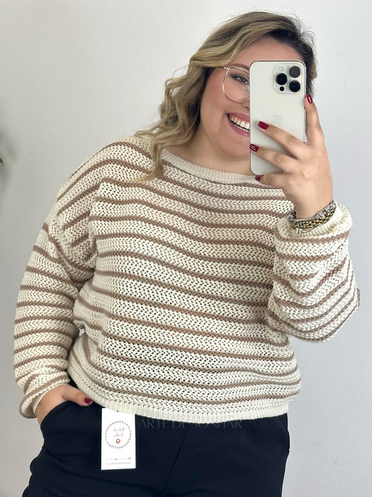 Camisola bege de crochet de manga comprida com riscas camel