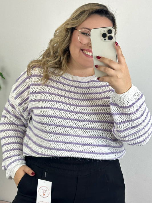 Camisola branca de crochet de manga comprida com riscas lavanda