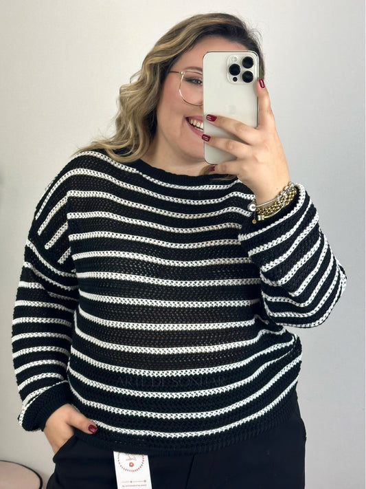 Camisola preta de crochet de manga comprida com riscas brancas