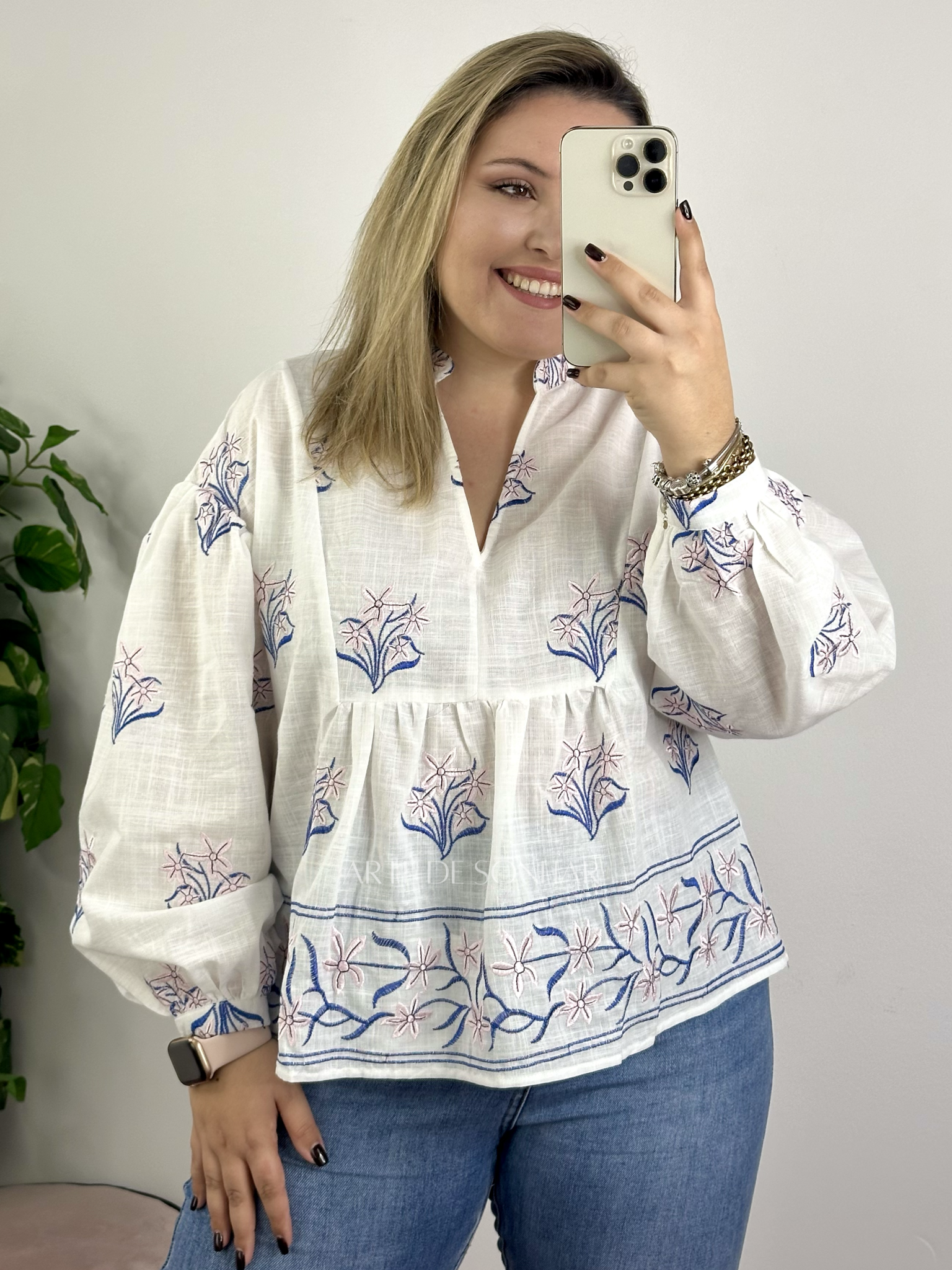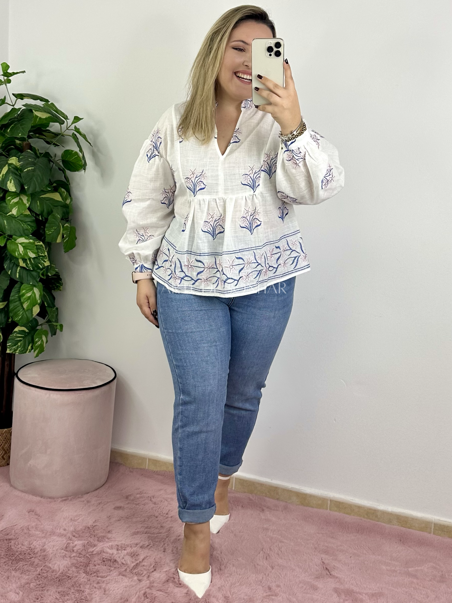 Blusa de flores rosa e azul