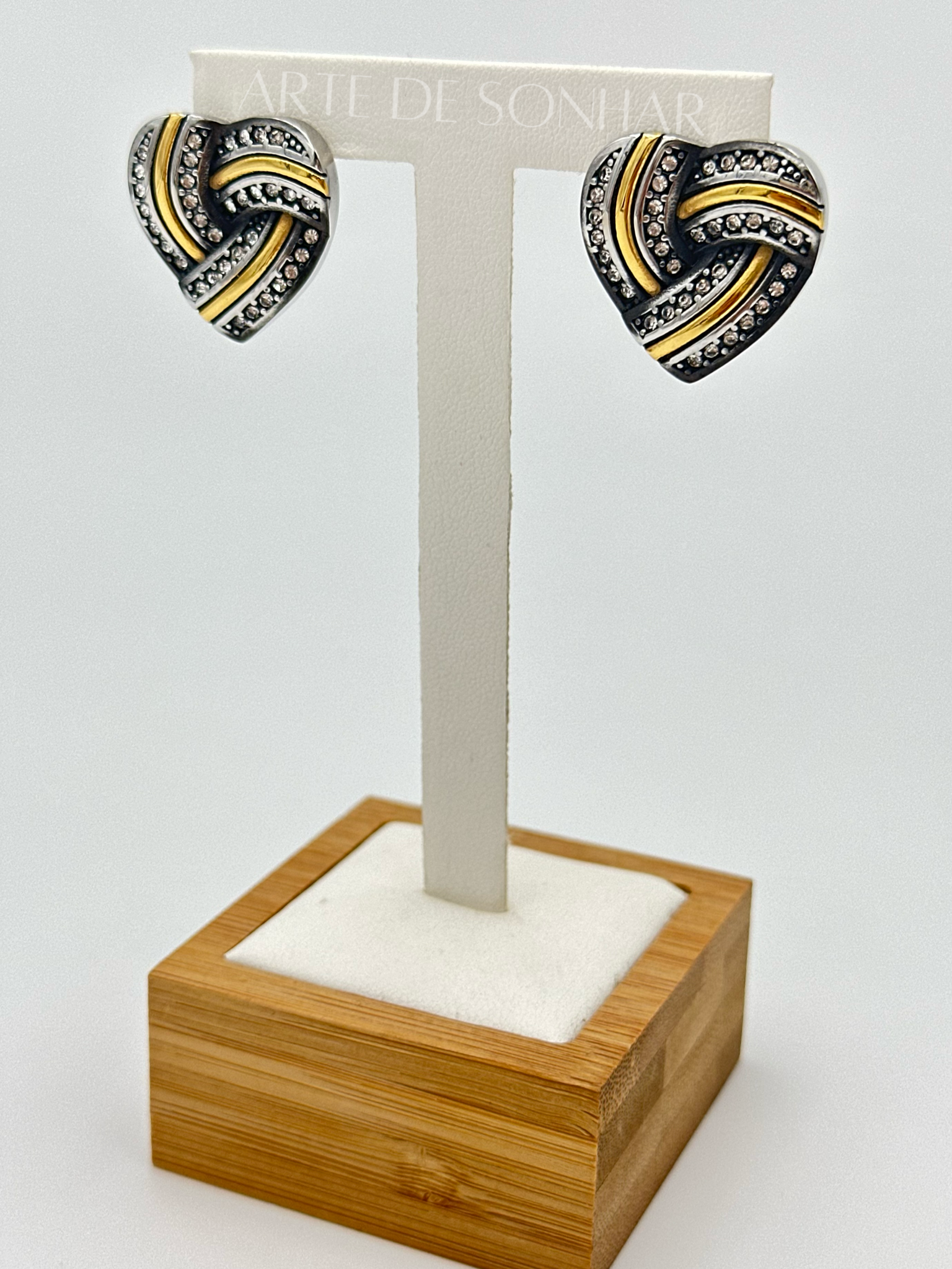 Brincos coração entrelaçado dourado, prateado e brilhantes