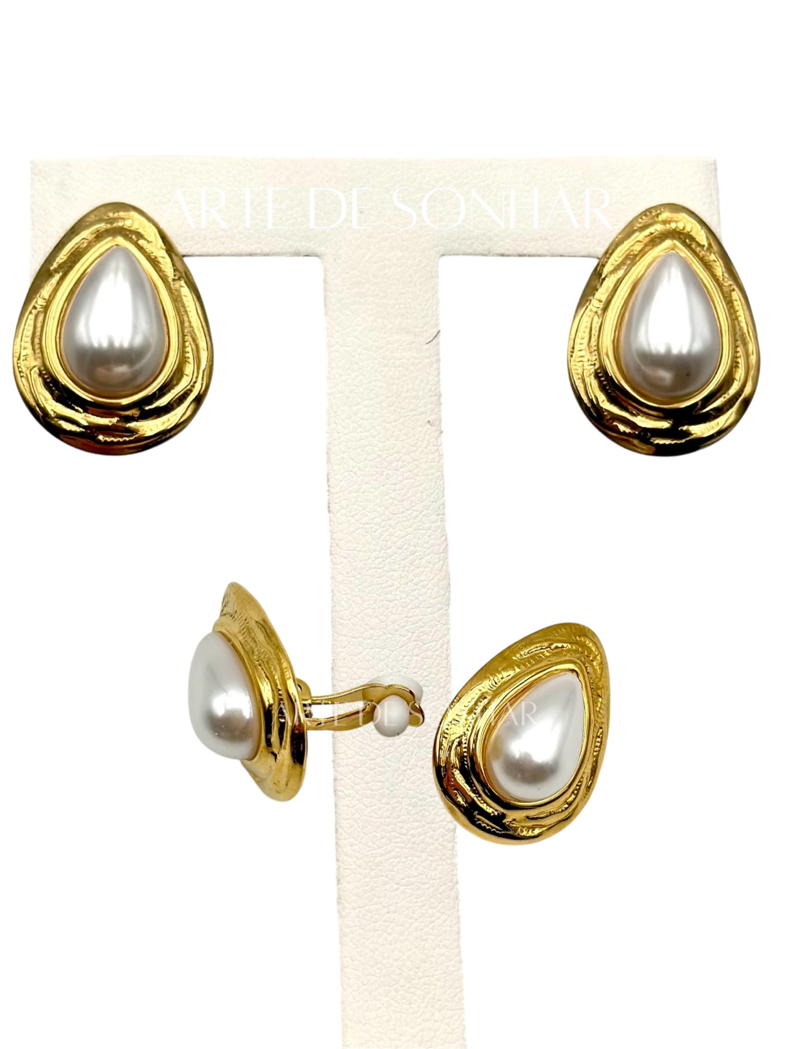 Brincos de mola dourados de gota com pérola ao centro