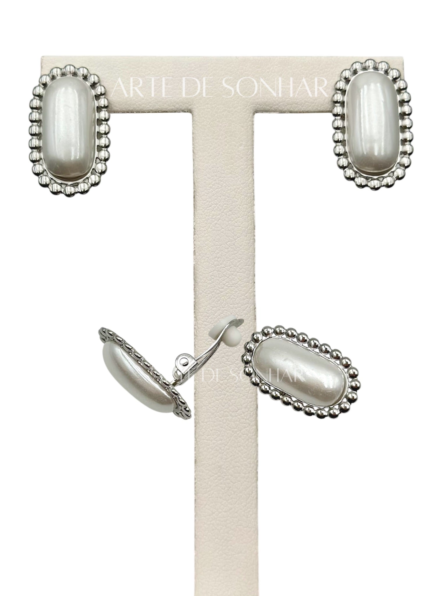 Brincos de mola prateados ovais com bolinhas com pérola