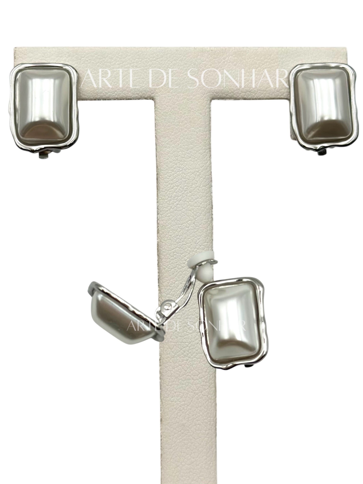 Brincos de mola prateados retangulares com pérola ao centro