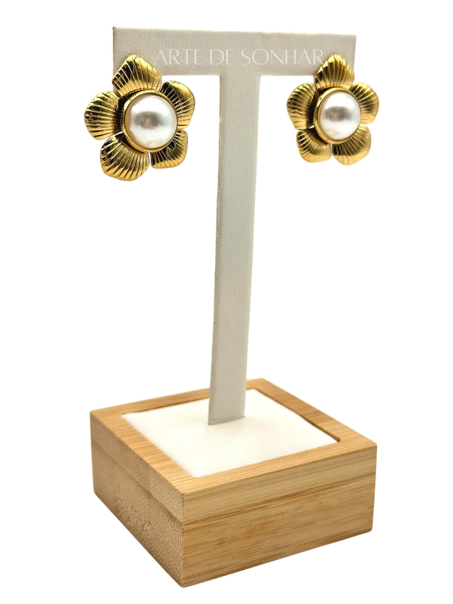 Brincos dourados com flores e pérola ao centro