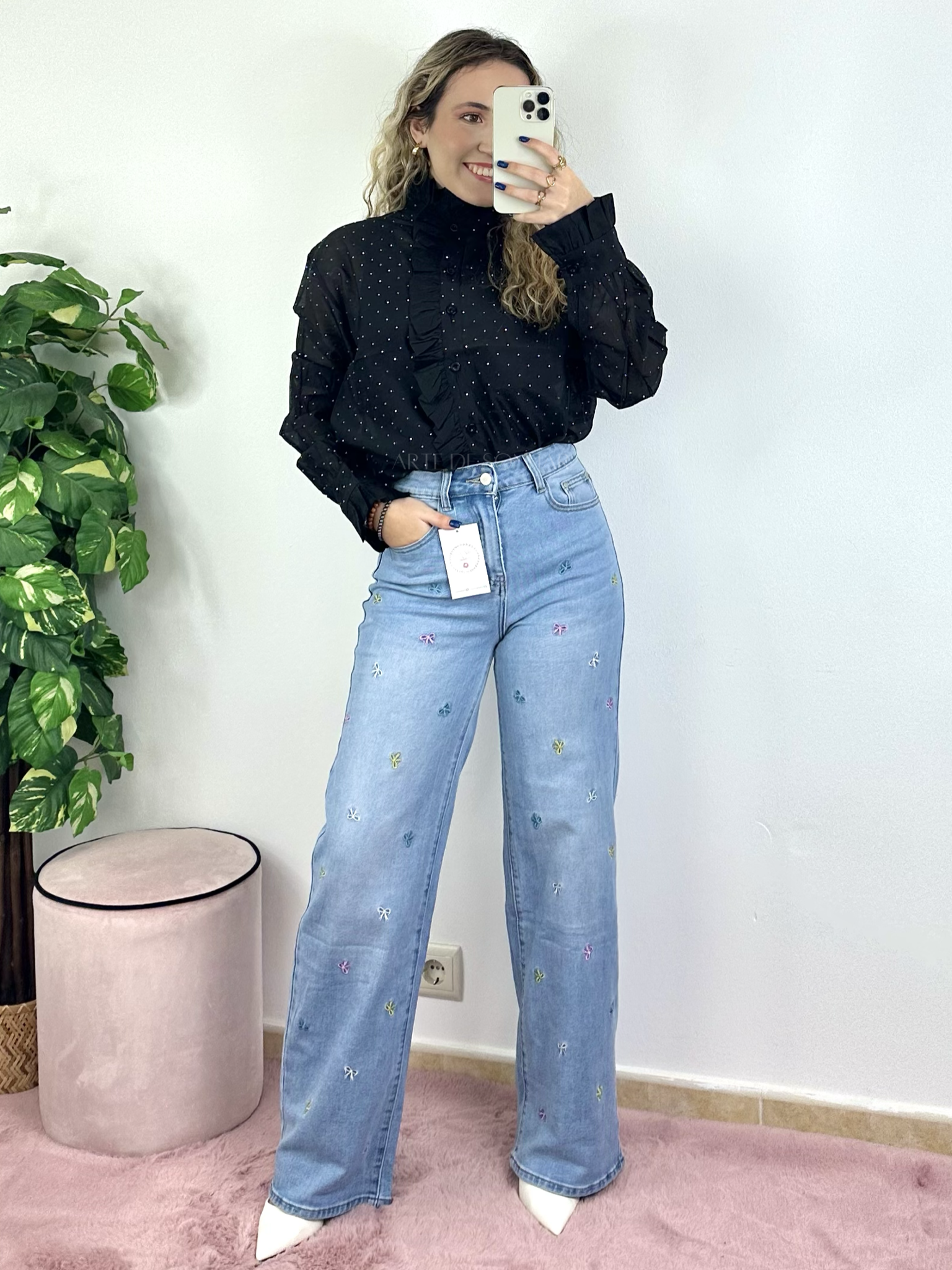 Camisa preta com transparências e folhos e brilhantes