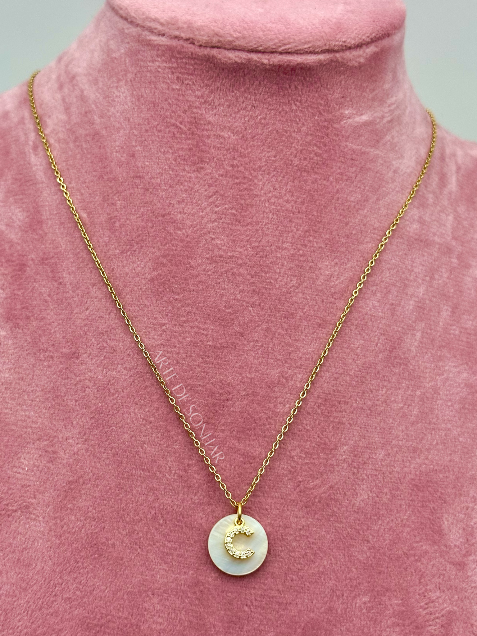 Colar letra C dourada brilhante com madre pérola