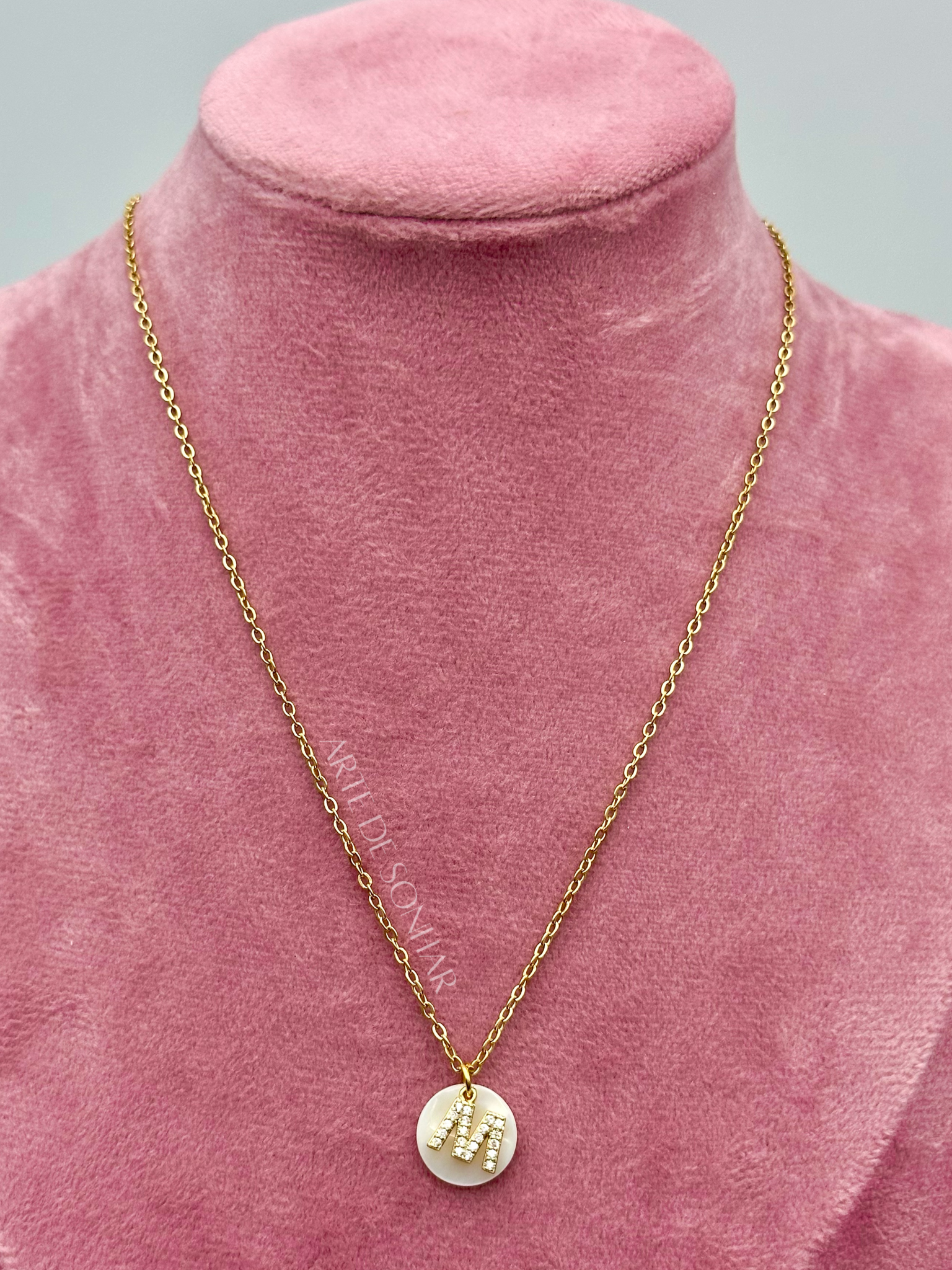 Colar letra M dourada brilhante com madre pérola