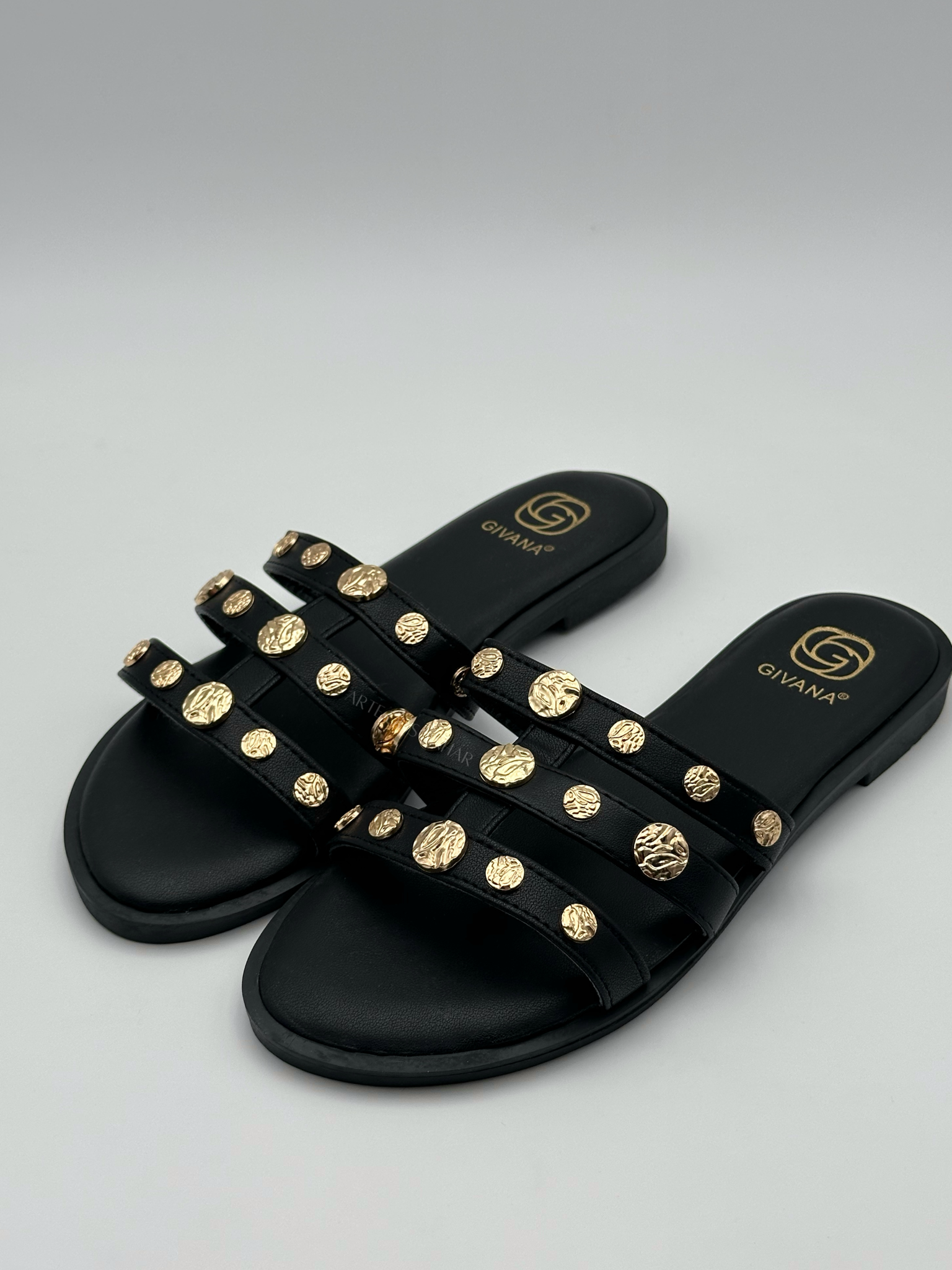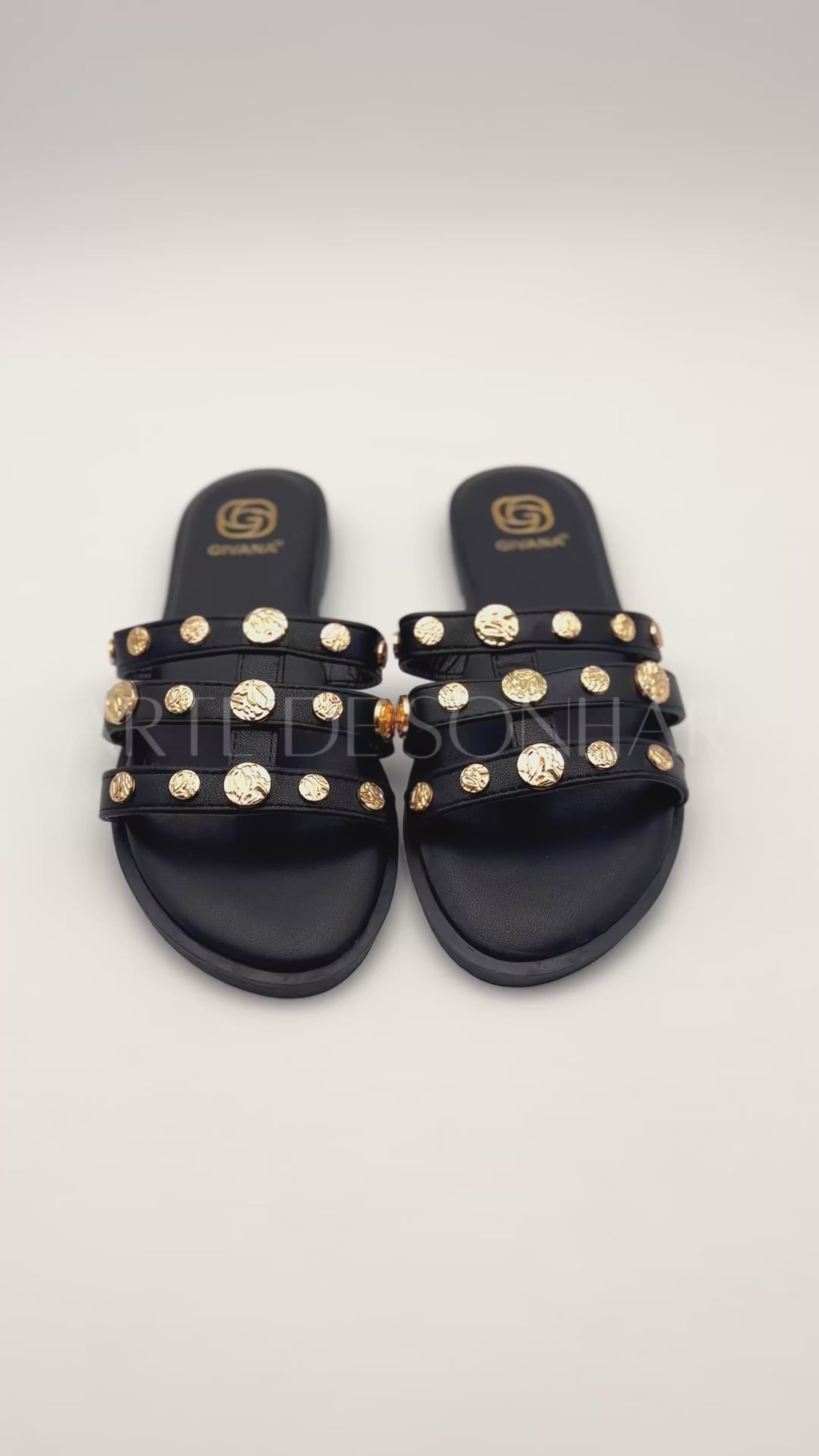 Sandálias rasas com tiras e tachas